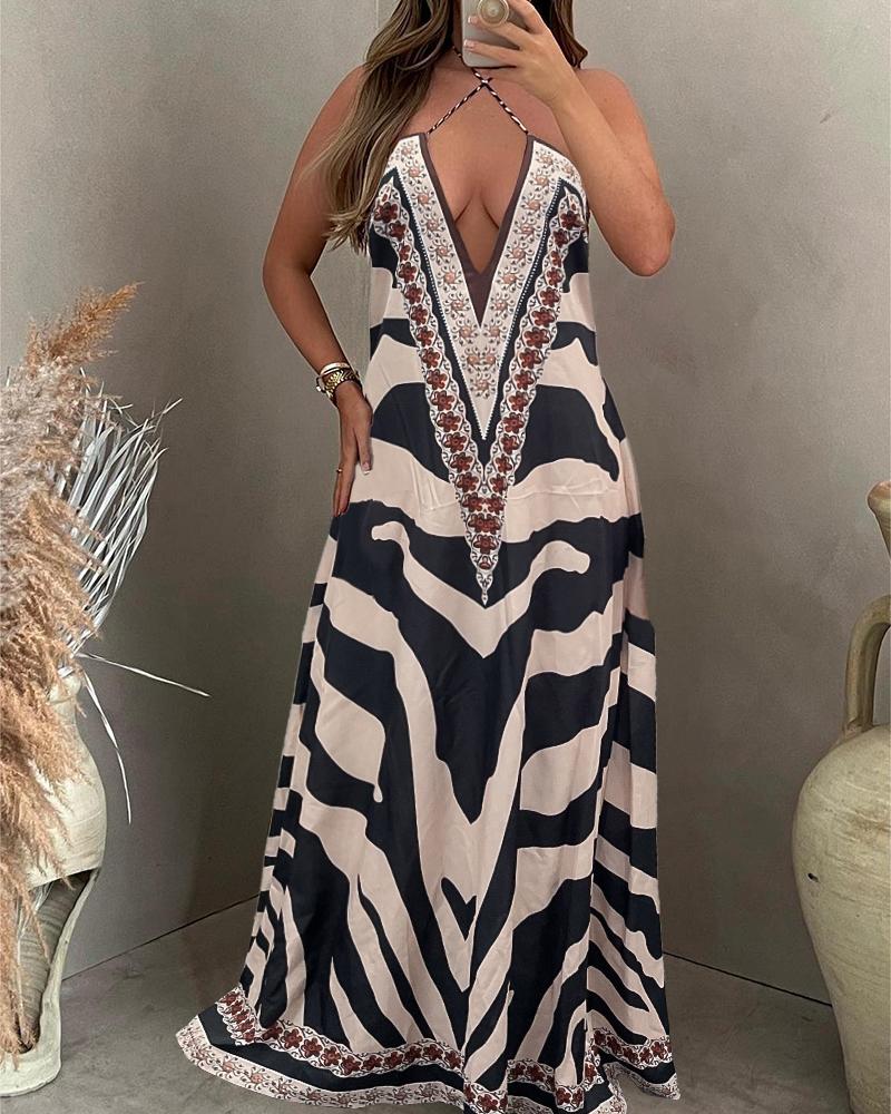 Style:Chic Type:Flared Material:100%Polyester Neckline:Plunge Sleeve Style:Sleeveless Length:Maxi Pattern Type:Abstract,Tribal Decoration:Others Fit Type:Regular Occasion:Daily,Vacation Package Include:1* Dress Fabric Elasticity:Slight Stretch Sheer:No Care Instructions:Machine wash or professional dry clean Waist Line:Natural