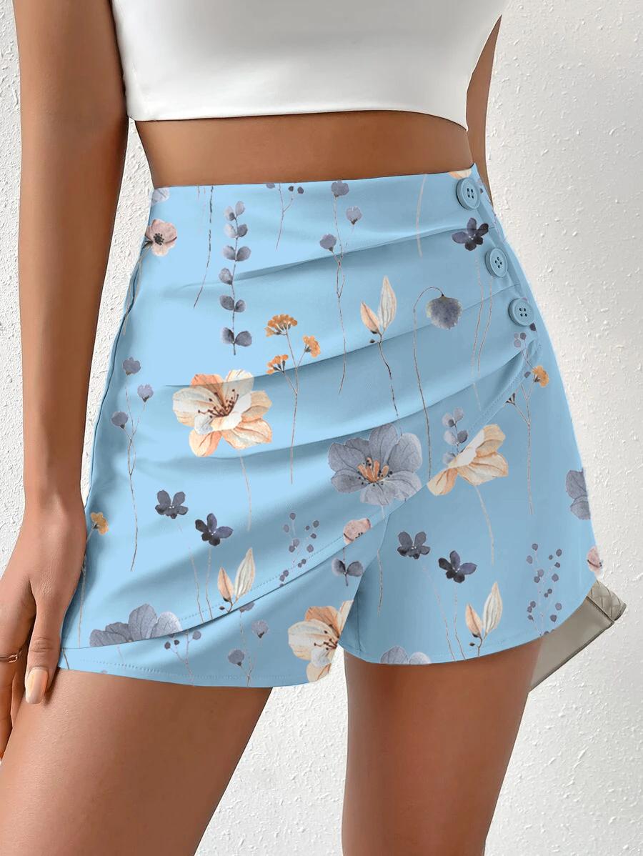 Floral Print Side Button Ruched Shorts