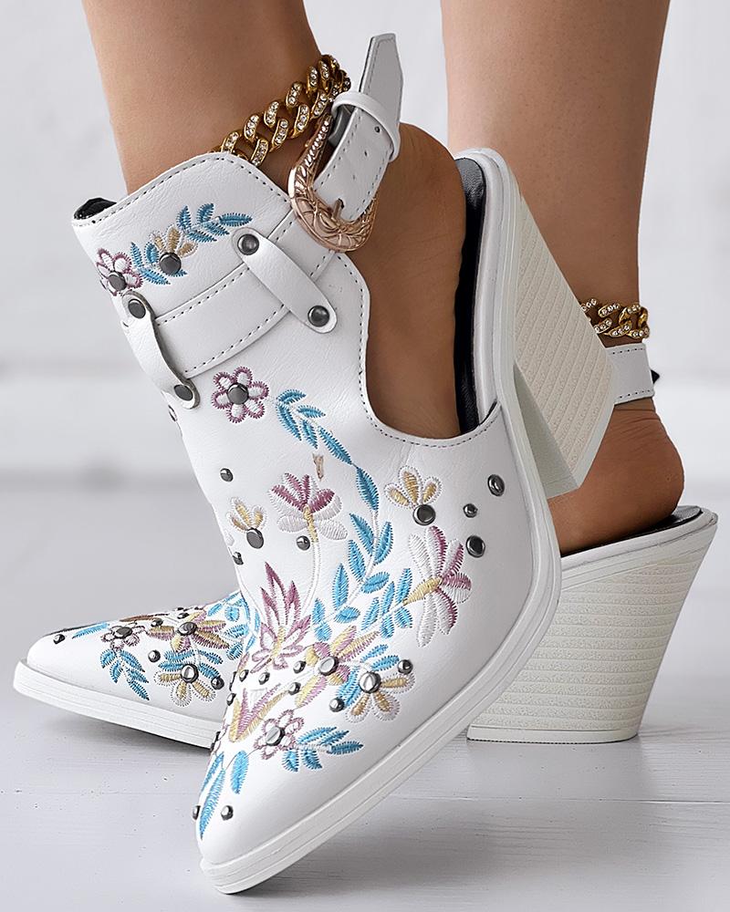 Floral Embroidery Studded Slingback Buckled Boots