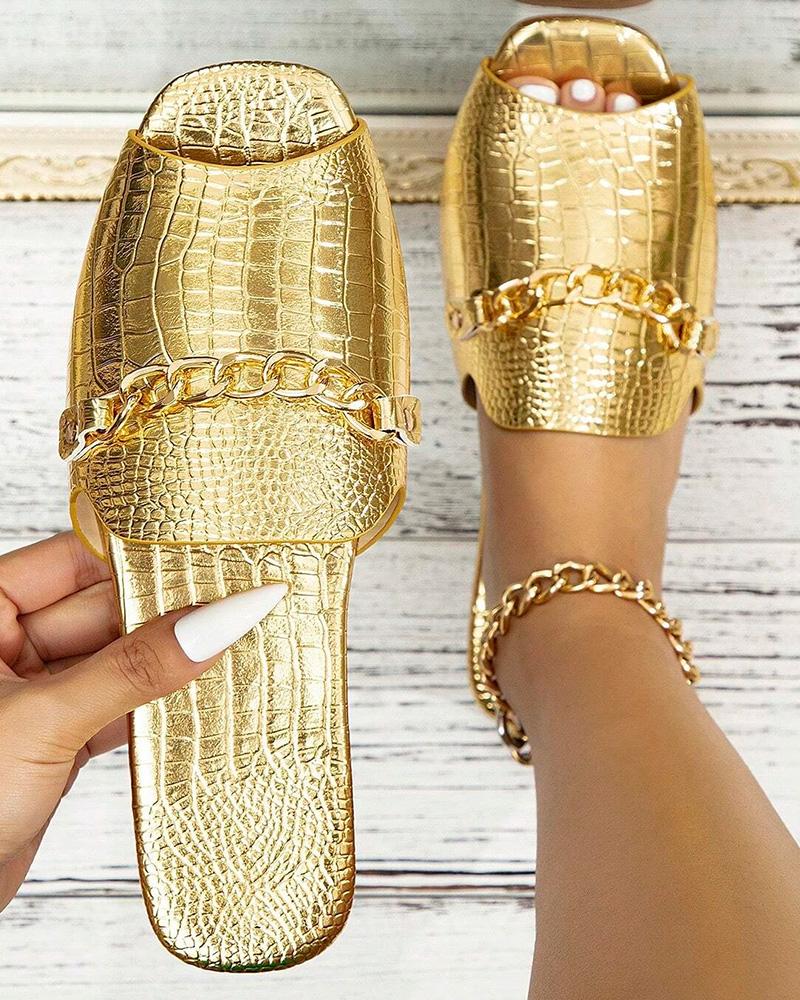 Style:Casual Type:Slippers Pattern Type:Crocodile Decoration:Chain Occasion:Daily Toe:Peep Toe Heel Height:Flat Package Include:1*Slippers