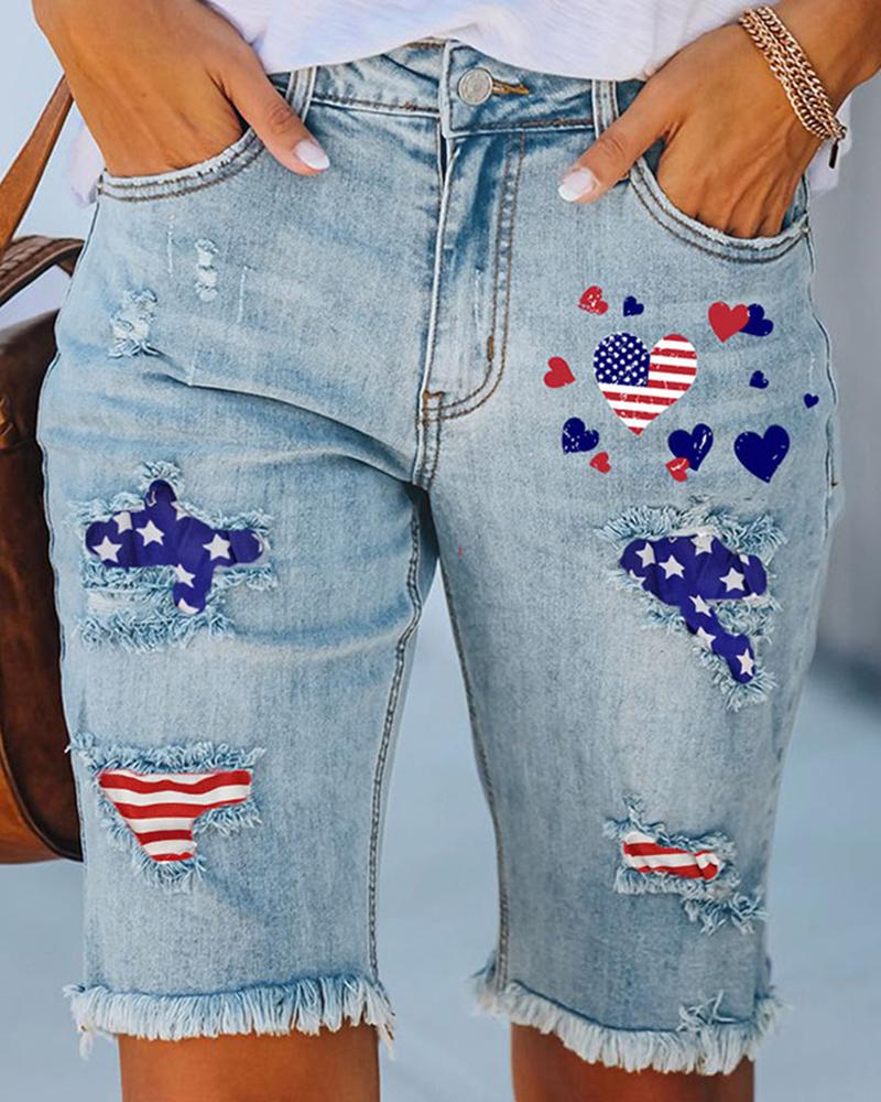 Independence Day Flag Print Ripped Raw Hem Denim Shorts