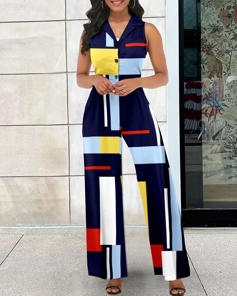 Style:Chic Type:Jumpsuit Material:Polyester Neckline:Notched Collar Sleeve Style:Sleeveless Length:Long Pattern Type:Colorblock,Geometric Decoration:Button Fit Type:Regular Occasion:Daily Package Include:1*Jumpsuit Fabric Elasticity:Non-Stretch Sheer:No Care Instructions:Machine wash or professional dry clean