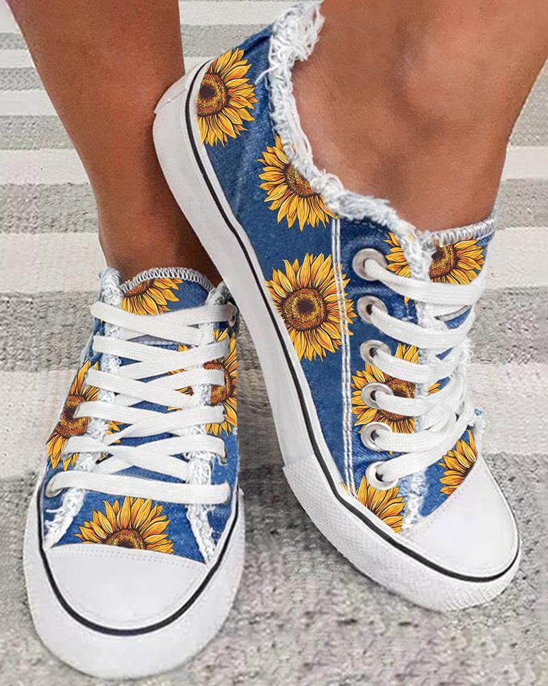 Sunflower Print Lace-up Canvas Sneakers