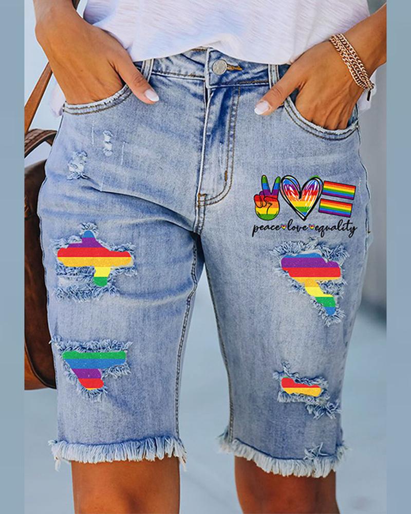 Style:Chic,Denim Type:Denim Shorts Material:Denim Length:Knee-Length Pattern Type:Rainbow Stripe,Graphic,Letter Decoration:Pocket,Raw Hem,Ripped Fit Type:Regular Occasion:Daily Package Include:1*Denim Shorts Fabric Elasticity:Slight Stretch Sheer:No Care Instructions:Machine wash or professional dry clean