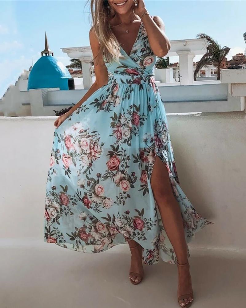 Style:Boho,Casual,Chic Type:Slit Material:Polyester Neckline:V-Neck Sleeve Style:Sleeveless Length:Maxi Pattern Type:Floral Decoration:Slit Fit Type:Regular Occasion:Daily,Vacation Package Include:1* Dress