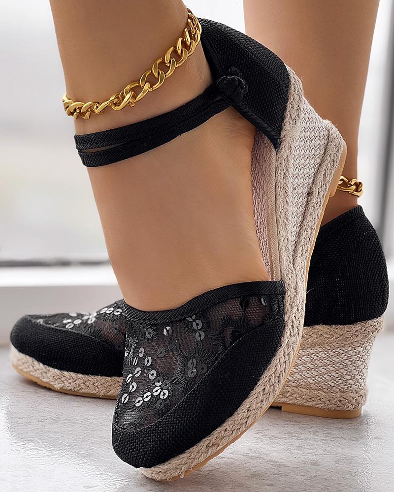 Style:Chic Type:Wedge Shoes Pattern Type:Contrast Paneled Decoration:Contrast Sequin Occasion:Daily Toe:Round Toe Heel Height:Low Heel Package Include:1*Wedge Sandals Strap Type:Ankle-strap