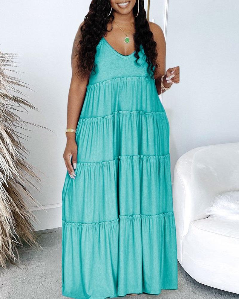 Style:Chic Type:Smock Material:Polyester Neckline:V-Neck Sleeve Style:Spaghetti Strap Length:Maxi Pattern Type:Plain Decoration:Frill Hem,Ruched Fit Type:Regular Occasion:Daily Package Include:1* Dress Fabric Elasticity:Non-Stretch Sheer:No Care Instructions:Machine wash or professional dry clean Waist Line:Natural