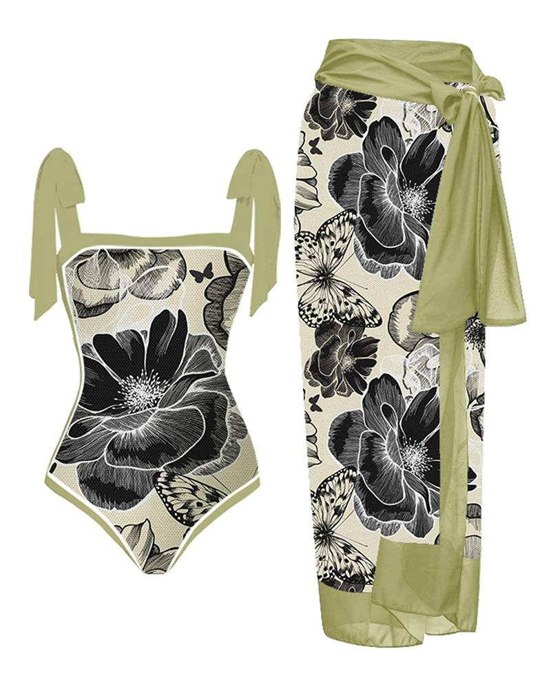 Floral Butterfly Print Tied Detail One Piece Swimsuit With Cover Up Skirt