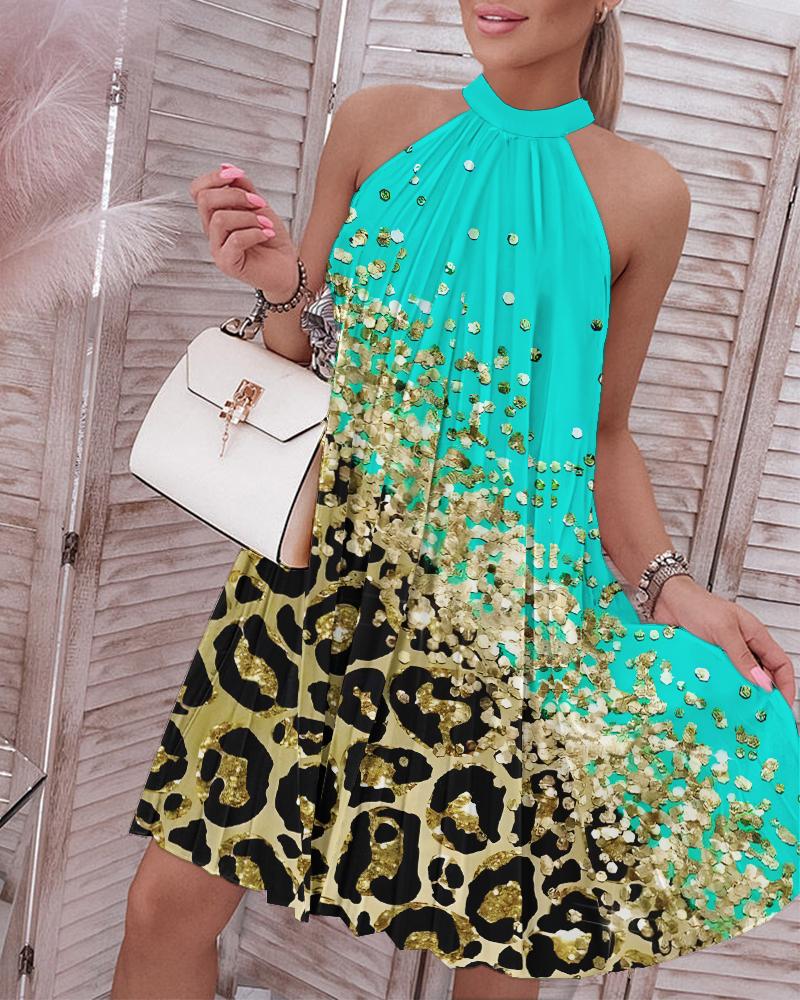 Style:Casual Type:Pleated Material:100%Polyester Neckline:Halter Sleeve Style:Sleeveless Length:Mini Pattern Type:Leopard Decoration:Ruched Fit Type:Regular Occasion:Daily Package Include:1* Dress Fabric Elasticity:Non-Stretch Sheer:No Care Instructions:Machine wash or professional dry clean Waist Line:Natural