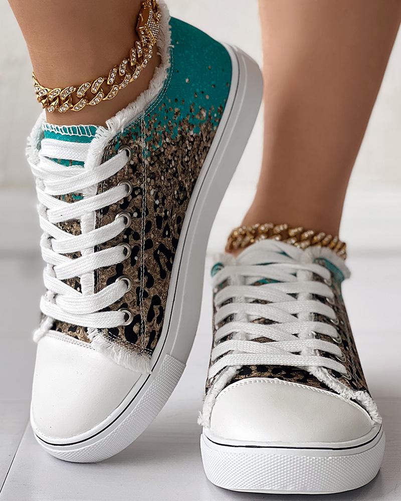 Contrast Leopard Fringe Hem Lace-up Canvas Sneakers