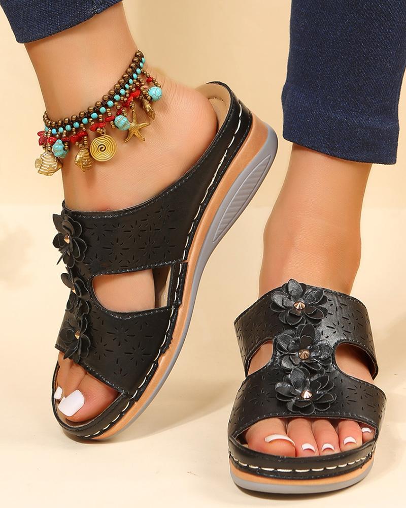 Floral Pattern Hollow Out Wedge Slippers