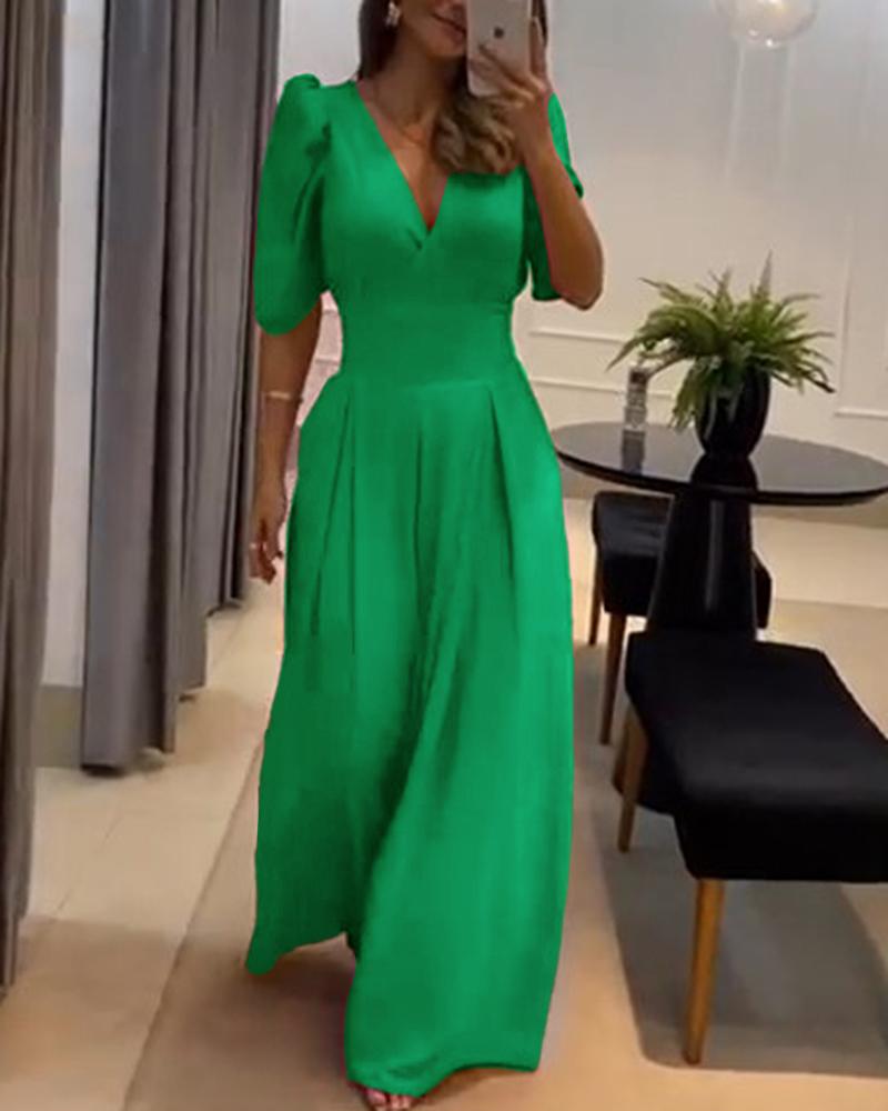 Style:Chic,Elegant Type:Jumpsuit Material:100%Polyester Neckline:V-Neck Sleeve Style:Half Sleeve,Puff Sleeve Length:Long Pattern Type:Plain Decoration:Ruched Fit Type:Regular Occasion:Daily,Wedding Guest,Work Package Include:1*Jumpsuit Fabric Elasticity:High Stretch Sheer:No Care Instructions:Machine wash or professional dry clean