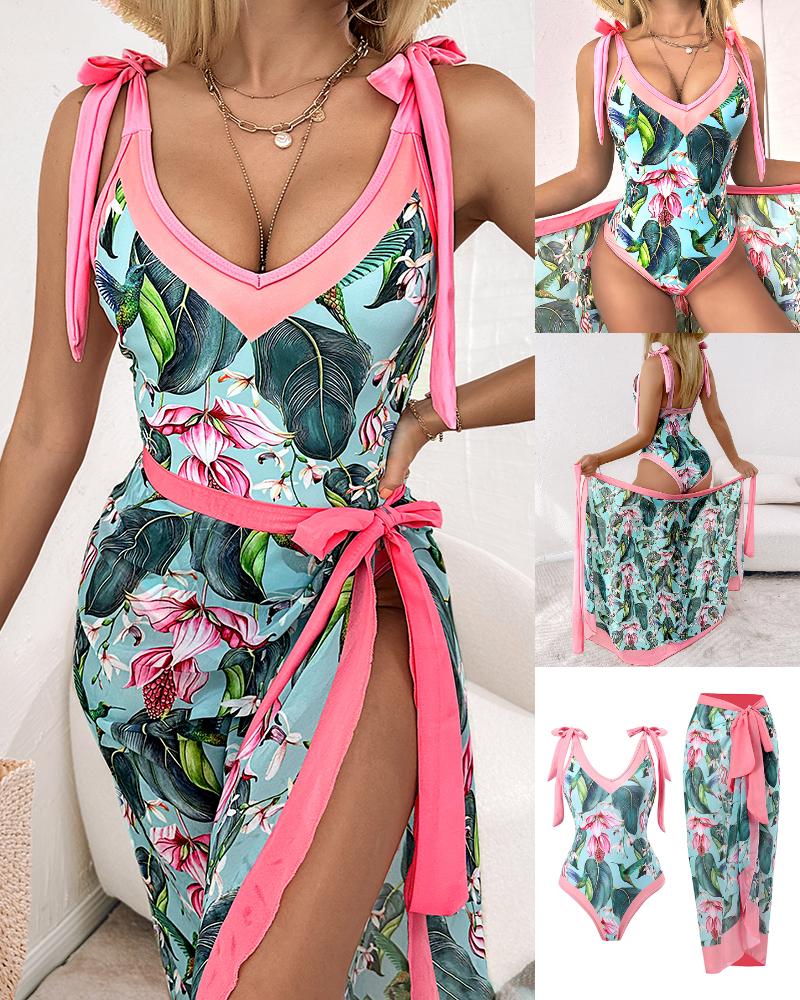 Animal Tropical Print Backless One Piece Swimsuit With Cover Up