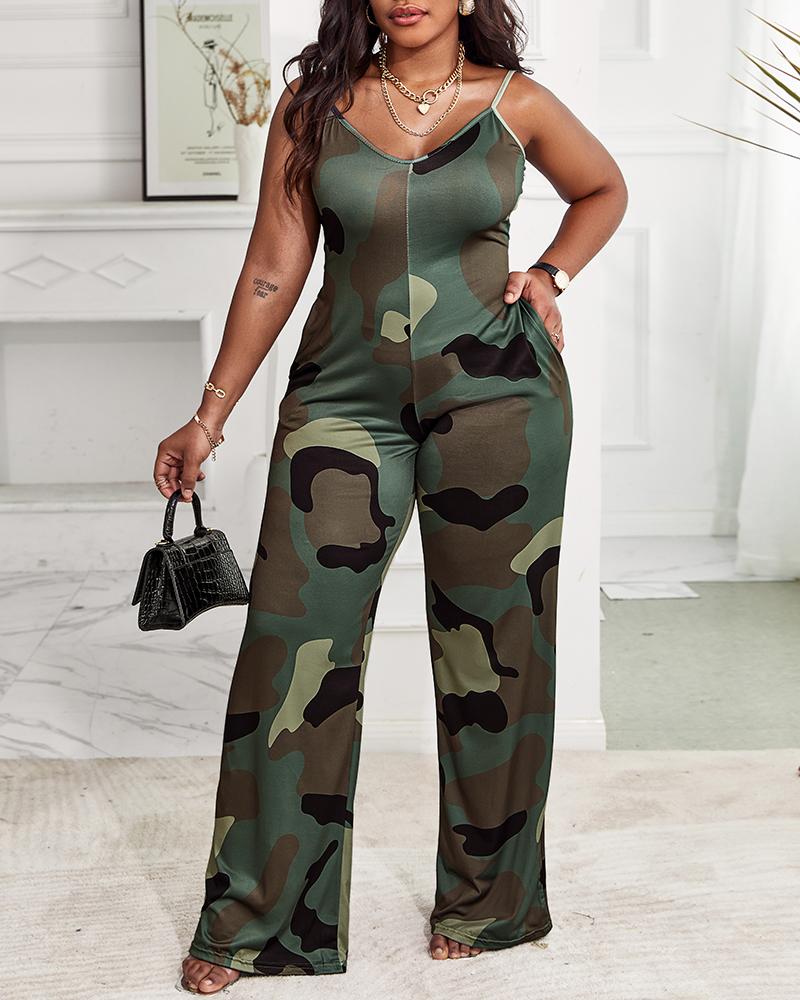 Plus Size Camouflage Print Spaghetti Strap Jumpsuit