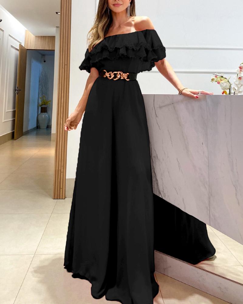 Style:Chic Type:Jumpsuit Material:100%Polyester Neckline:Off the Shoulder Sleeve Style:Short Sleeve Length:Long Pattern Type:Plain Decoration:Ruffles Fit Type:Regular With Belt:No Occasion:Daily Package Include:1*Jumpsuit(Without Belt) Fabric Elasticity:Slight Stretch