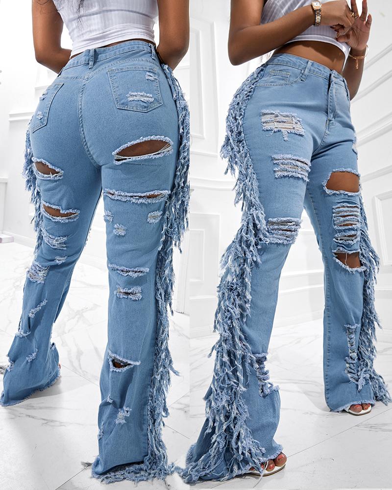 High Waist Ripped Cutout Fringe Jeans