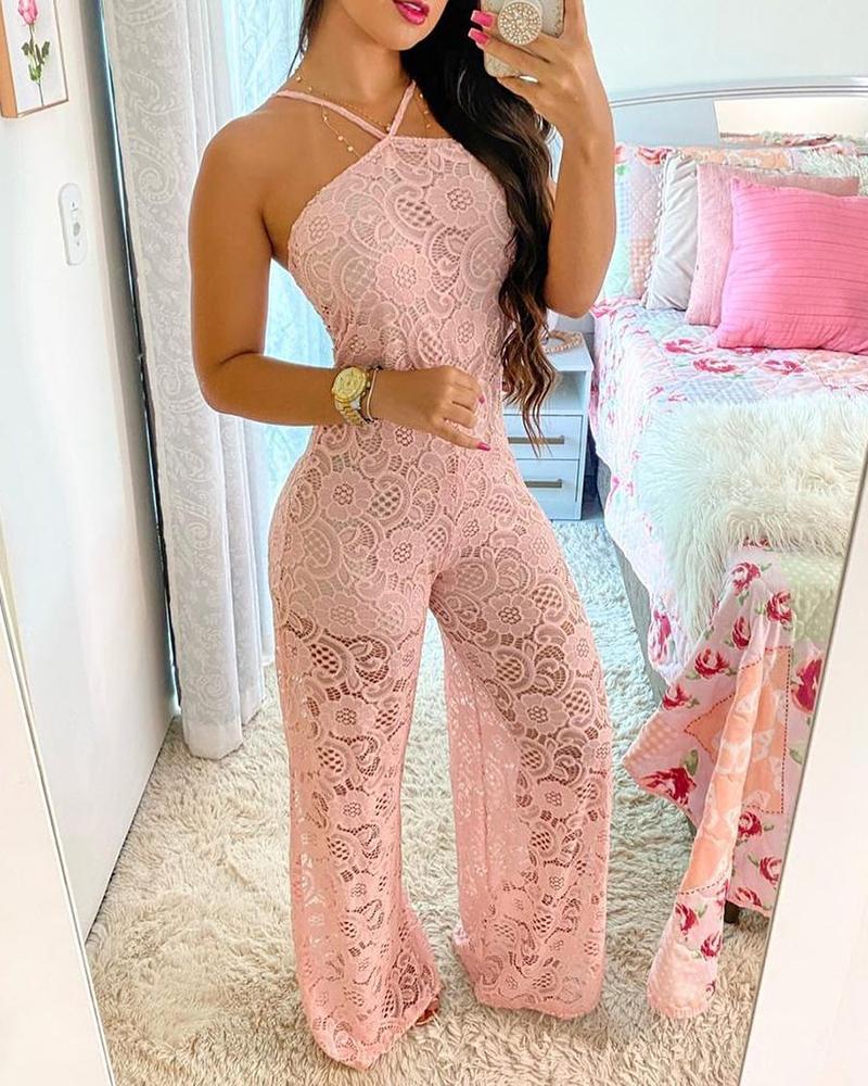 Style:Romantic Type:Jumpsuits Material:Lace Neckline:Halter Sleeve Style:Sleeveless Length:Long Pattern Type:Plain Decoration:Lace,Slit Fit Type:Regular Occasion:Daily Package Include:1*Jumpsuit
