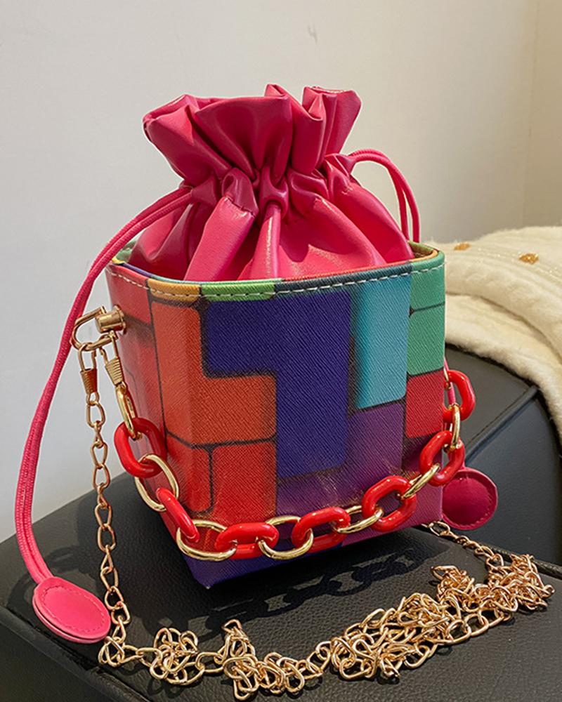 Colorblock Chain Strap Drawstring Bucket Bag