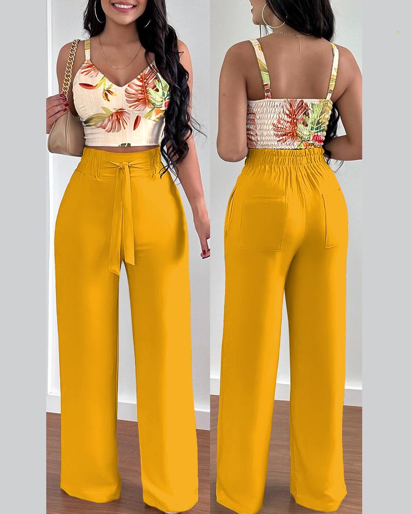 Style:Casual Type:Pants Sets Material:100%Polyester Neckline:V-Neck Sleeve Style:Sleeveless Length:Long Pattern Type:Tropical Decoration:Pocket,Shirred,Tied Detail Fit Type:Regular Occasion:Daily,Vacation Package Include:1*Pants Set Fabric Elasticity:High Stretch Sheer:No Care Instructions:Machine wash or professional dry clean
