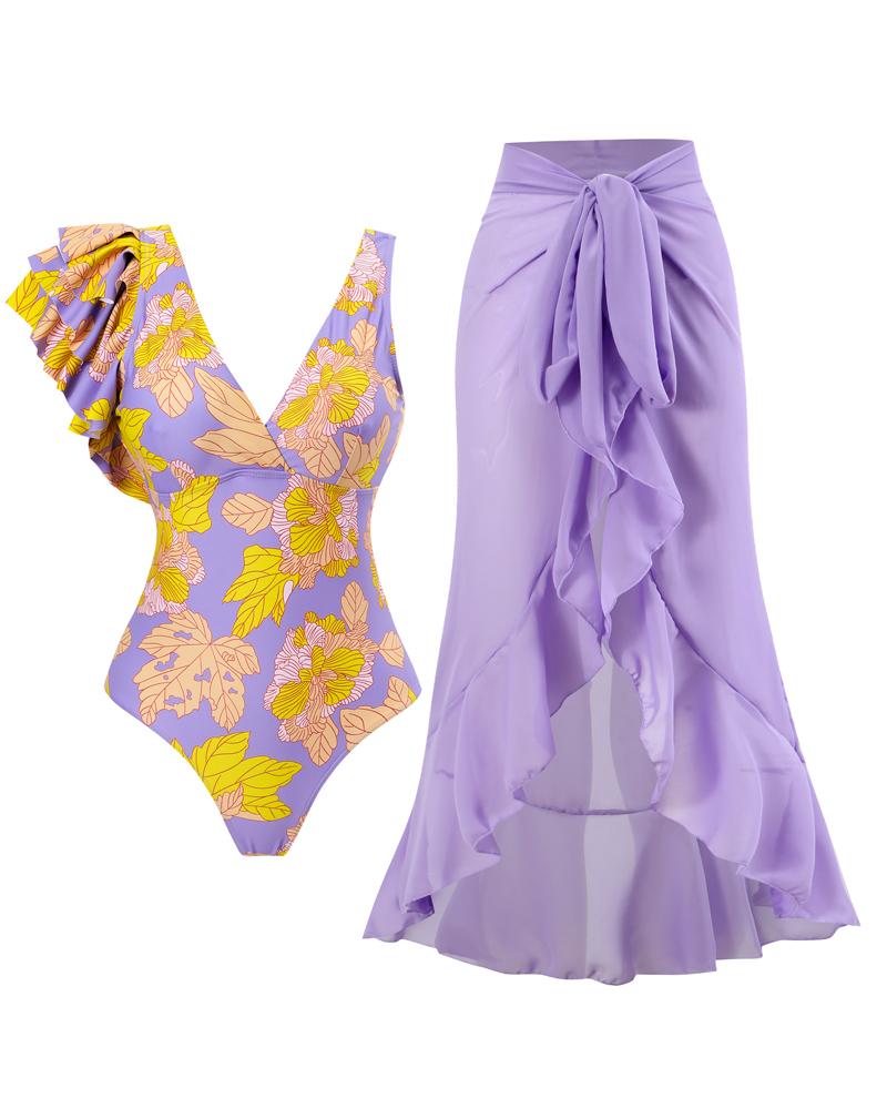 Plants Print Ruffle Hem One-Piece Swimsuit With Cover Up