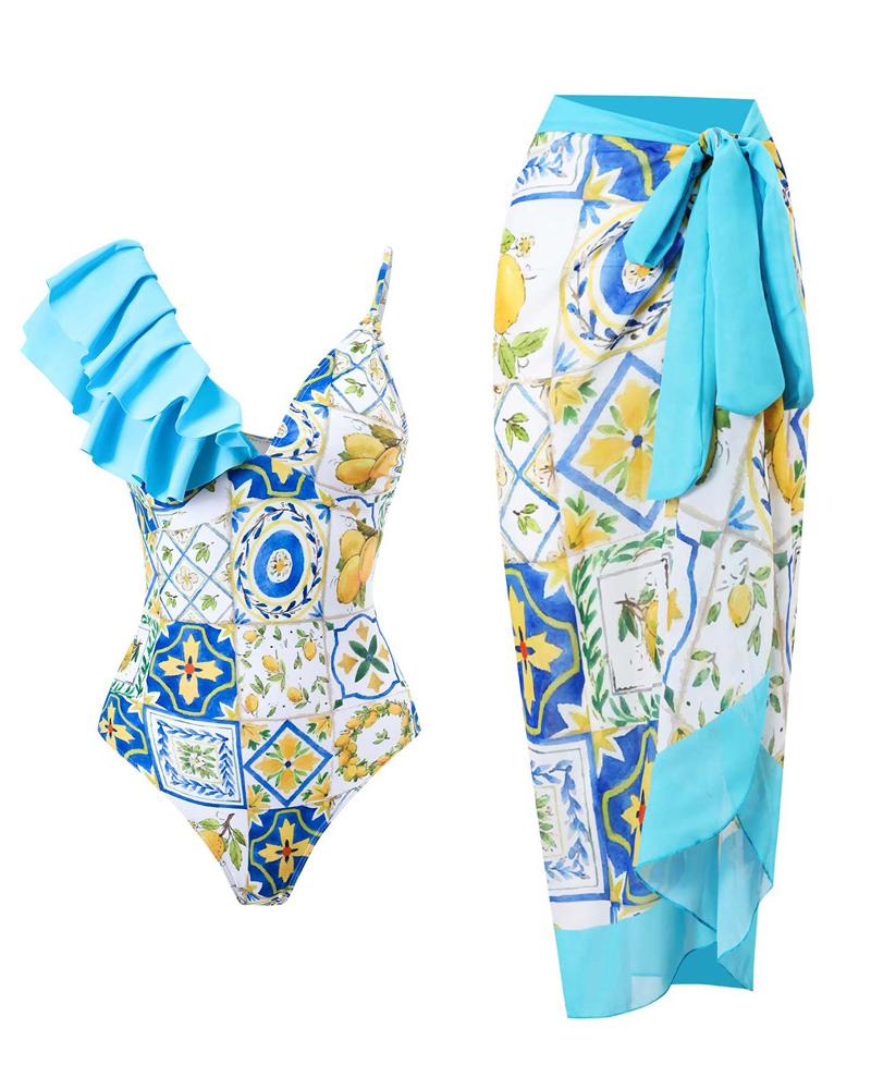 Scarf Print Ruffle Hem One-Piece Swimsuit With Cover Up
