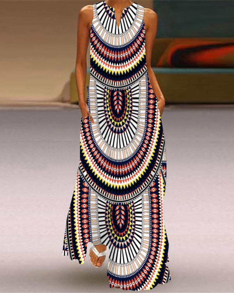 Style:Casual,Chic Type:Straight Material:Polyester Neckline:V-Cut Sleeve Style:Sleeveless Length:Maxi Pattern Type:Geometric Fit Type:Regular Occasion:Daily Package Include:1* Dress