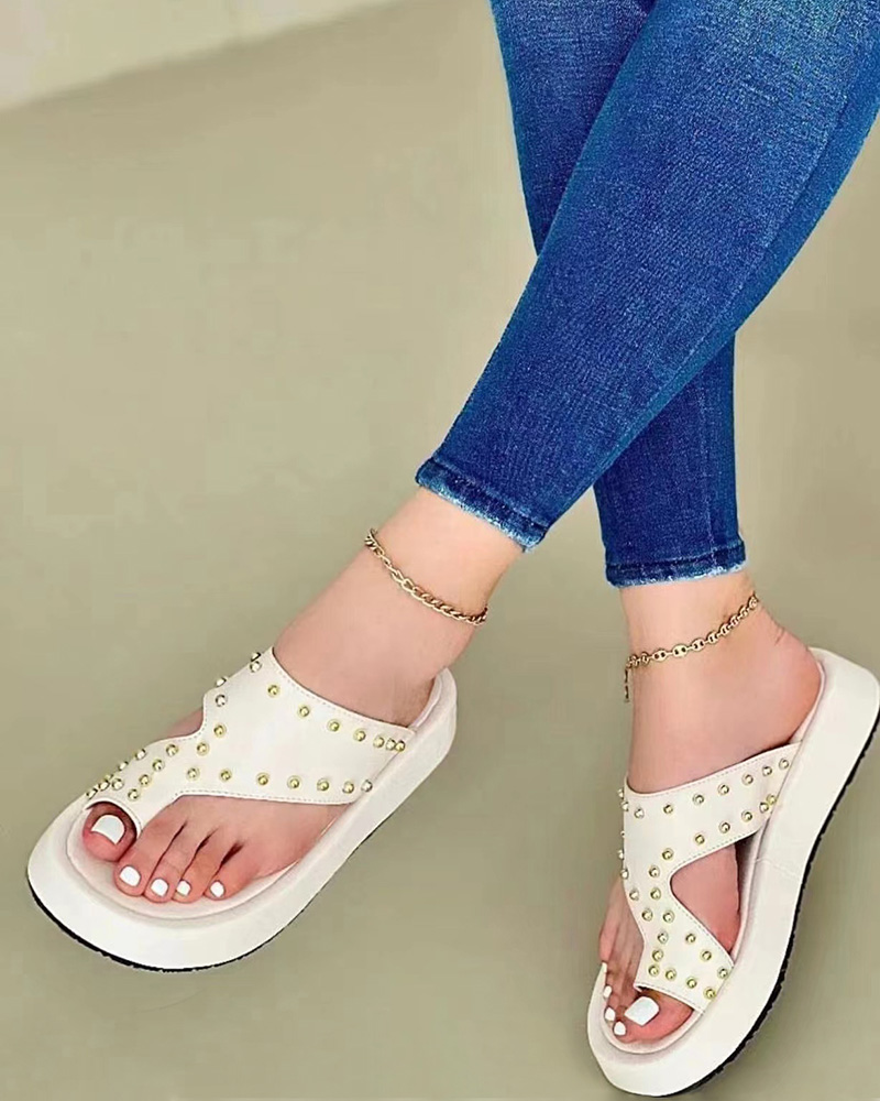 Style:Chic Type:Slippers Pattern Type:Plain Decoration:Studded,Hollow-out Occasion:Beach,Daily,Vacation Toe:Square Toe,Toe Post Heel Height:Flat Package Include:1*Slippers