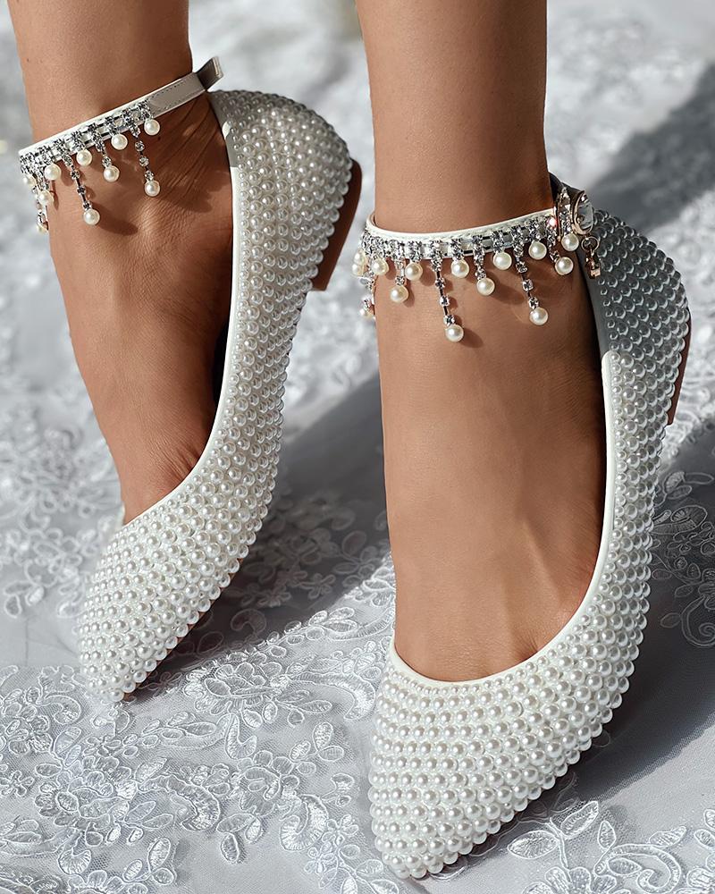 Style:Chic Type:Slip-On Material:PU Leather Pattern Type:Plain Decoration:Pearls,Rhinestone,Tassel Occasion:Evening,Party Toe:Point Toe Heel Height:Flat Package Include:1*Wedding Loafers(Without Anklet)