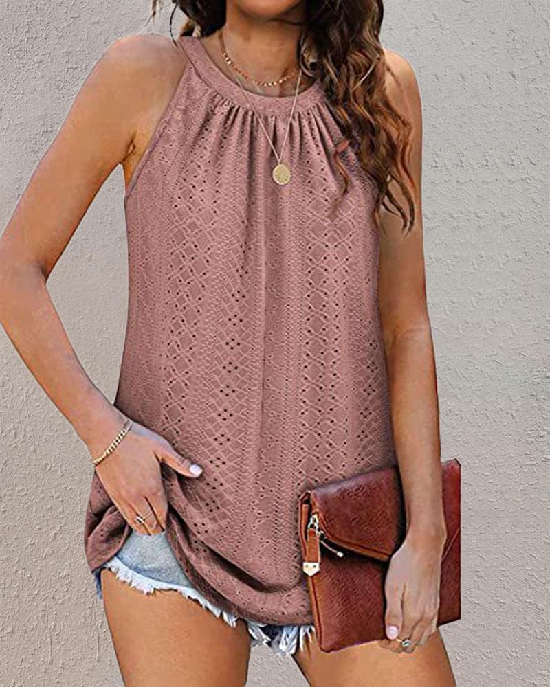 Style:Casual Type:Tank Material:Polyester Neckline:Halter Sleeve Style:Sleeveless Length:Regular Pattern Type:Plain Decoration:Ruched,Eyelet Embroidery Fit Type:Regular Occasion:Daily,Vacation Package Include:1*Top