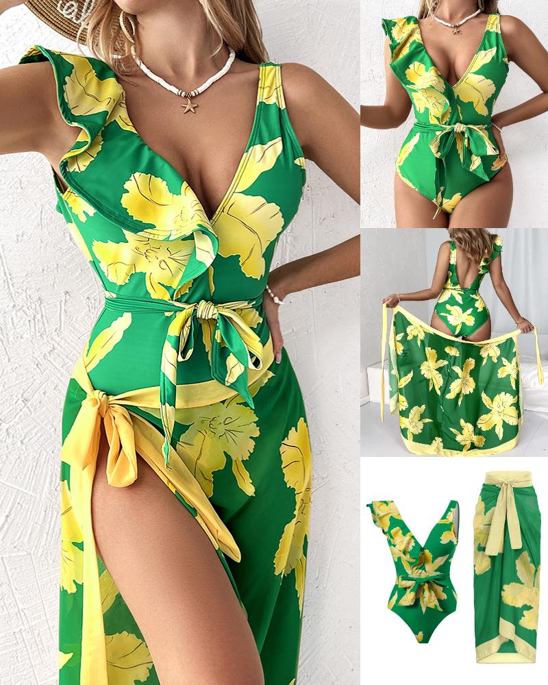 Plants Print Ruffle Hem One-Piece Swimsuit With Cover Up