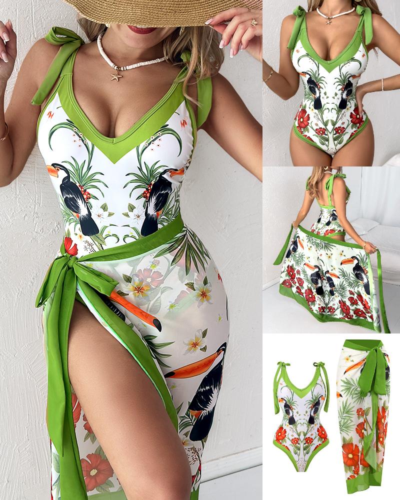 Plants Bird Print One-Piece Swimsuit With Cover Up