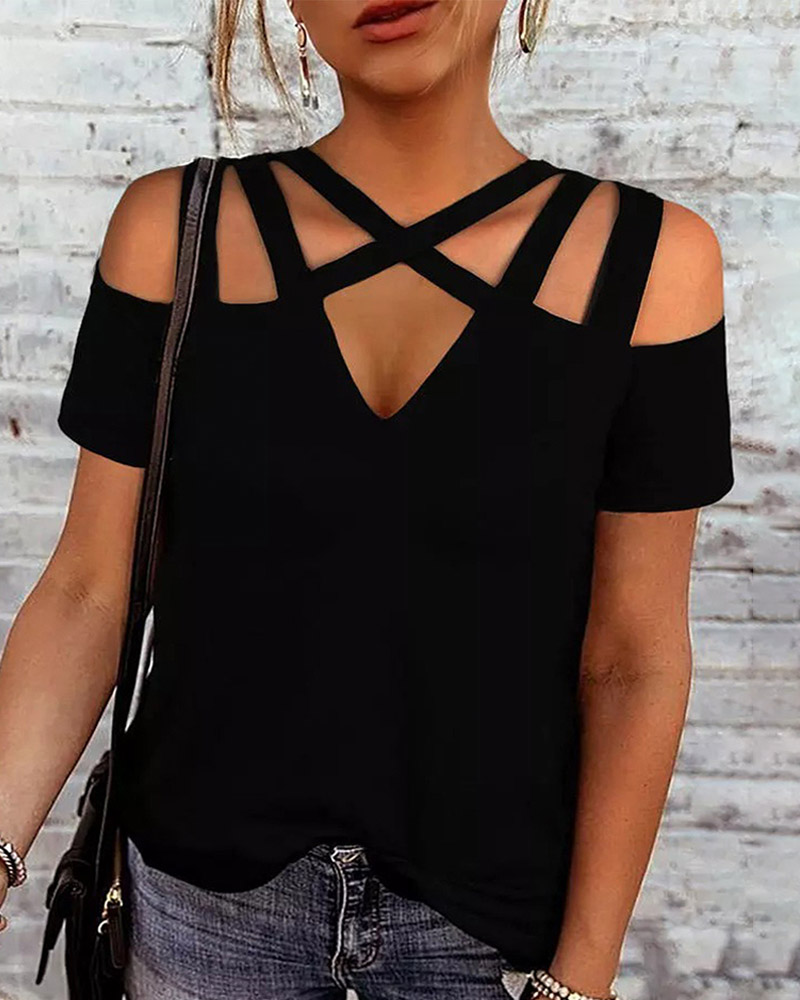 Style:Casual Type:Regular Material:95%Polyester,5%Elastane Neckline:Cold Shoulder Sleeve Style:Short Sleeve Length:Regular Pattern Type:Plain Decoration:Criss Cross,Cutout Fit Type:Regular Occasion:Daily Package Include:1*T-Shirt