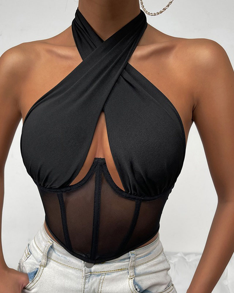 Eyelet Embroidery Lace Patch Halter Wrap Tank Top