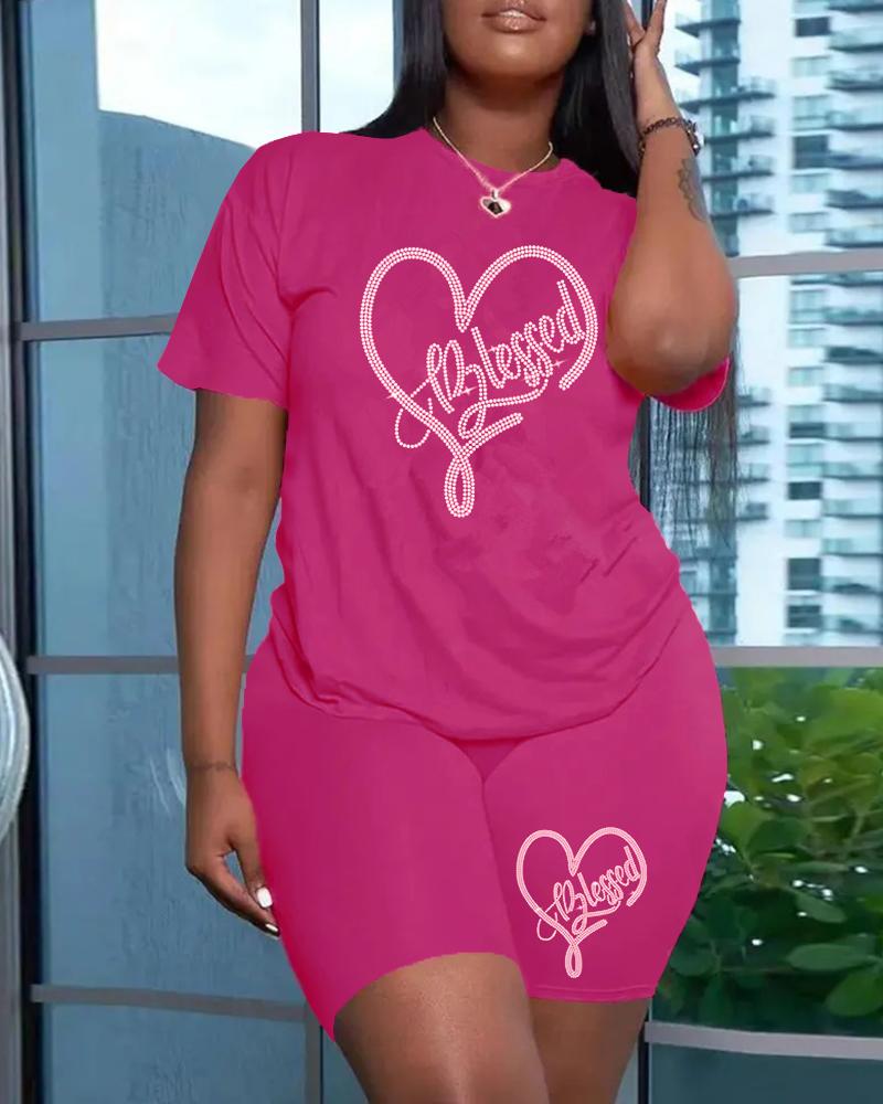 O-Neck Letter Pattern Rhinestone Top & Shorts Set