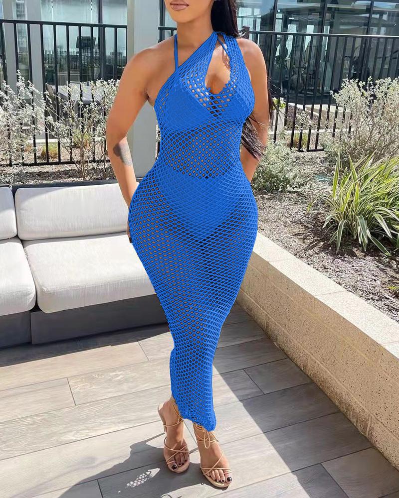 Style:Sexy Type:Cover Ups Material:Polyester Neckline:One Shoulder Sleeve Style:Sleeveless Length:Maxi Pattern Type:Plain Decoration:Cutout,Fishnet Fit Type:Skinny Occasion:Vacation Package Include:1*Cover Up (Without Bikini)