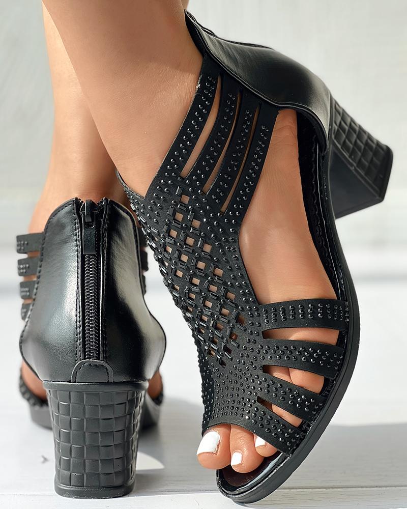 Hollow Out Rhinestone Chunky Heel Sandals