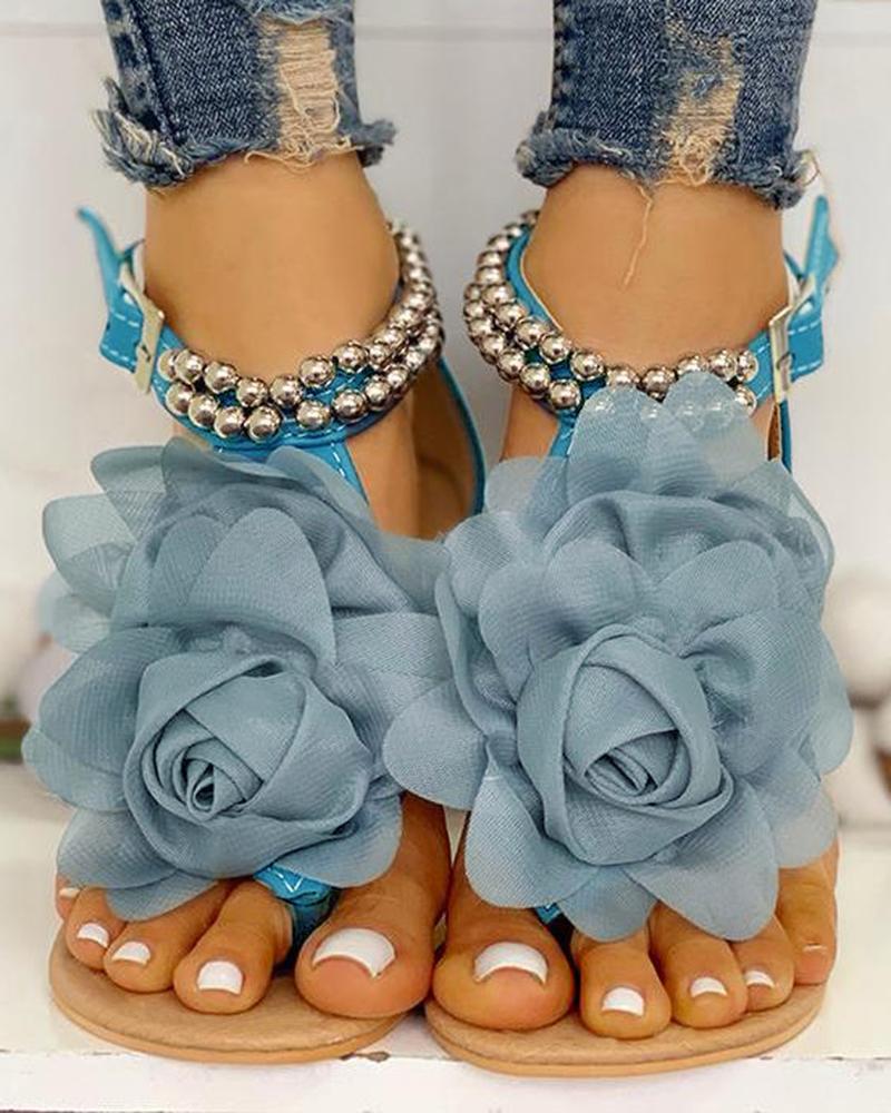 Style:Fashion Type:Flat Sandals Material:PU,Mesh Pattern Type:Floral Decoration:Beaded Occasion:Daily,Vacation Toe:Round Toe,Toe Post Heel Height:Flat Package Include:1*Sandals Note: There might be 2-3% difference according to manual measurement. Please check the measurement chart carefully before you buy the item. +Please note that slight color difference should be acceptable due to the light and screen.