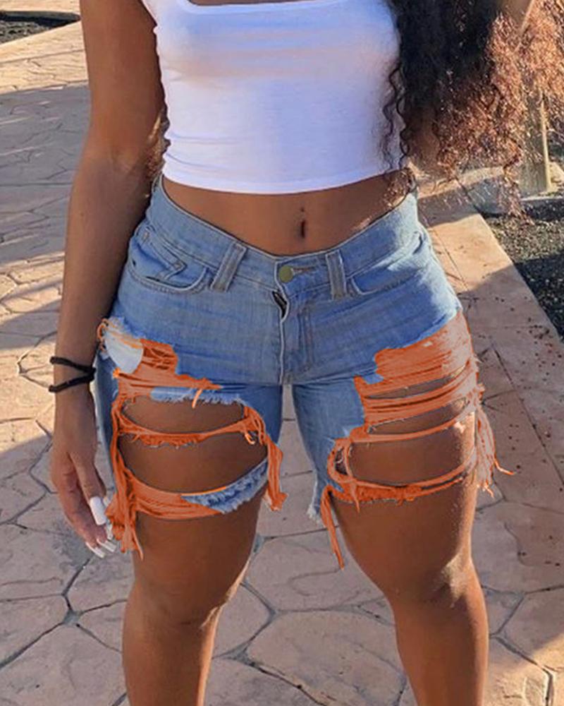 Style:Chic,Denim Type:Denim Shorts Material:Denim Length:Above Knee Pattern Type:Contrast Paneled,Plain Decoration:Button,Cutout,Pocket,Raw Hem,Ripped,Washed,Zipper Fit Type:Regular Occasion:Daily Package Include:1*Shorts Fabric Elasticity:Non-Stretch Sheer:No Care Instructions:Machine wash or professional dry clean