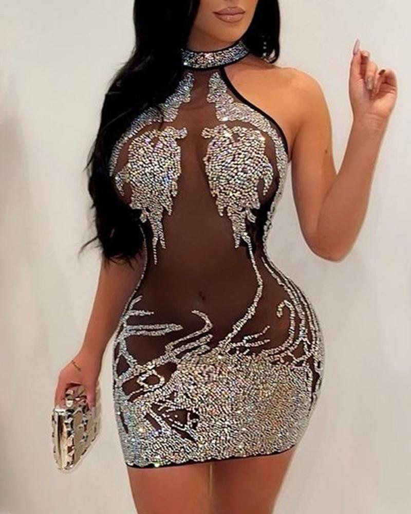 Sheer Mesh Contrast Rhinestone Bodycon Dress