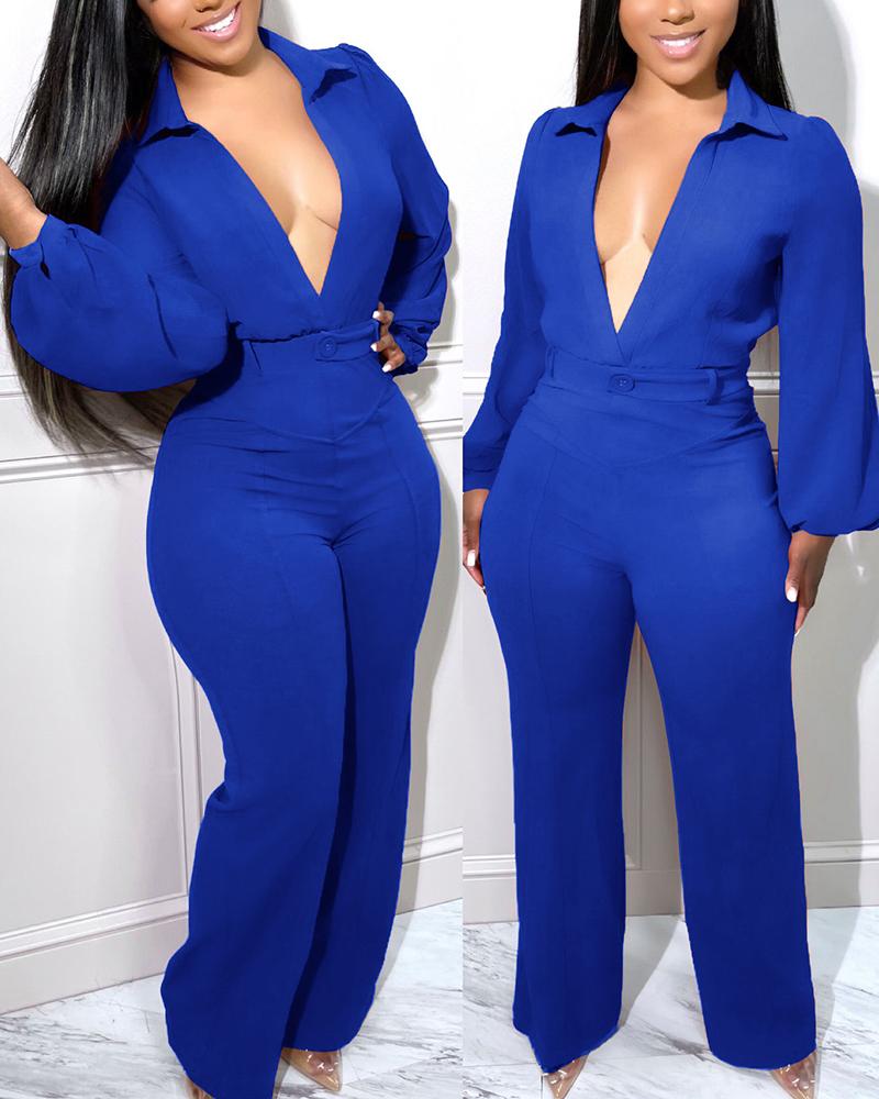 Style:Chic,Casual Type:Jumpsuit Material:Polyester Neckline:Plunge Sleeve Style:Long Sleeve,Lantern Sleeve Length:Long Pattern Type:Plain Fit Type:Regular Occasion:Daily Package Include:1*Jumpsuit