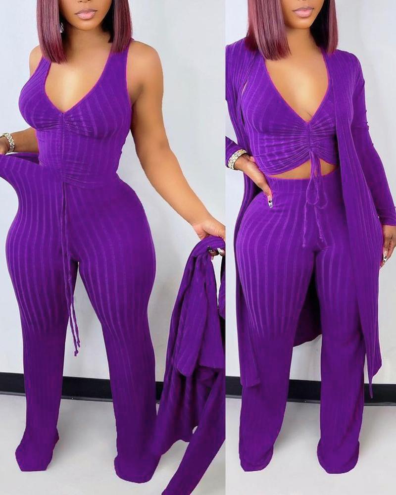 Style:Casual Type:Pants Sets,Suit Set Material:Ribbed Neckline:Open Front,V-Neck Sleeve Style:Long Sleeve,Sleeveless Length:Long Pattern Type:Plain Decoration:Drawstring Fit Type:Regular Occasion:Daily Package Include:3PCS Pants Set (With Coat)