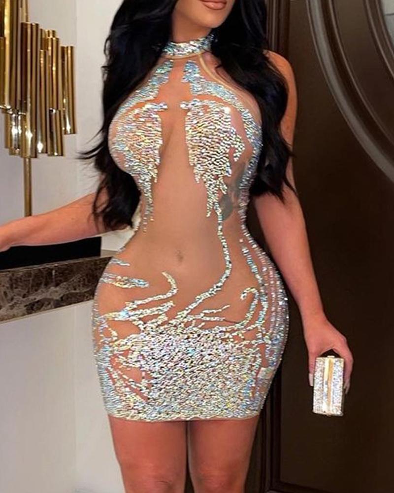 Sheer Mesh Contrast Rhinestone Bodycon Dress