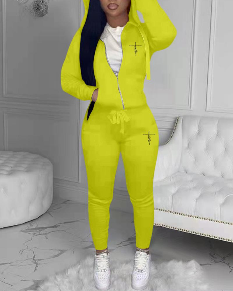 Zipper Pocket Design Letter Print Hoodie & Drawstring Pants Set