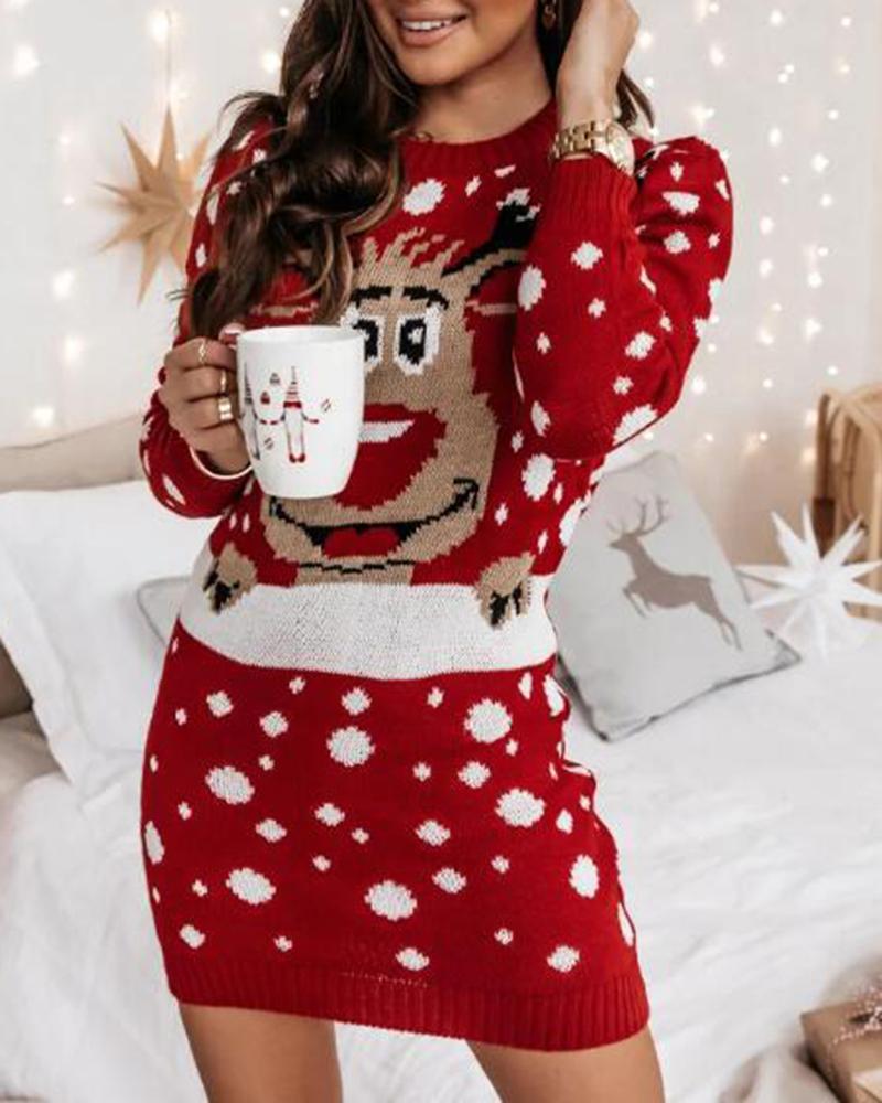 Christmas Cartoon Elk Pattern Long Sleeve Sweater Dress