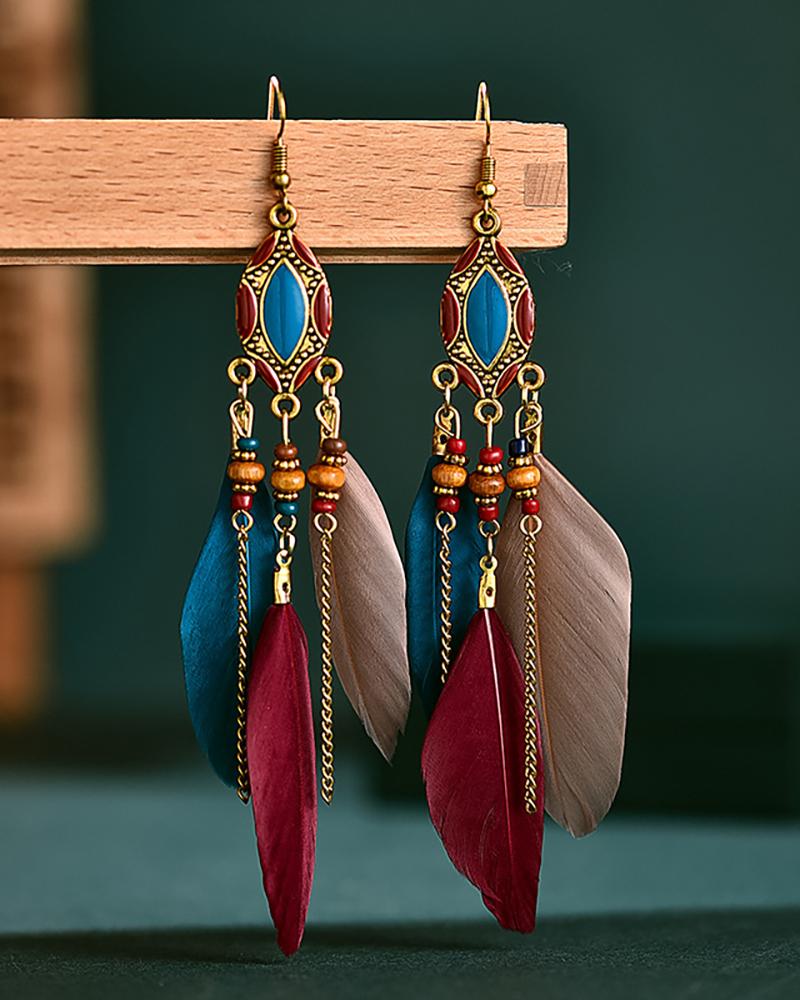 1Pair Retro Feather Beaded Bohemian Drop Earring