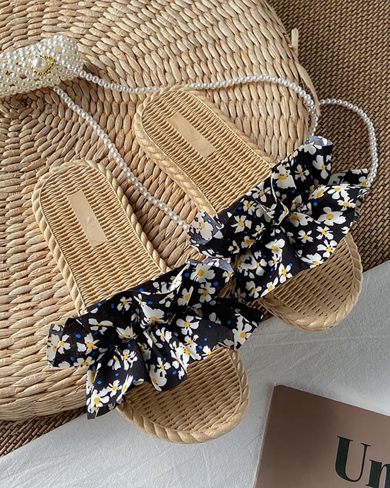 Style:Casual,Chic Type:Slippers Material:PU Pattern Type:Ditsy Floral Decoration:Ruched Occasion:Beach,Vacation Toe:Round Toe Heel Height:Flat Package Include:1*Slippers