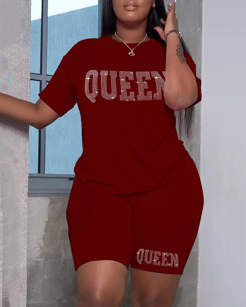 Style:Casual,Chic Type:Shorts Set Material:Polyester Neckline:O-neck Sleeve Style:Short Sleeve Length:Above Knee Pattern Type:Letter Decoration:Rhinestone Fit Type:Regular Occasion:Daily Package Include:Shorts Sets