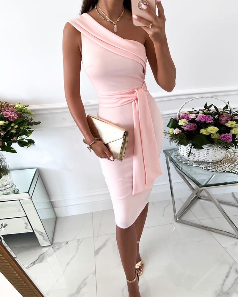 Style:Chic,Sexy Type:Pencil Material:Polyester Neckline:One Shoulder Sleeve Style:Sleeveless Length:Midi Pattern Type:Plain Decoration:Pastel,Tied Detail Fit Type:Skinny Occasion:Party,Wedding Guest Package Include:1* Dress
