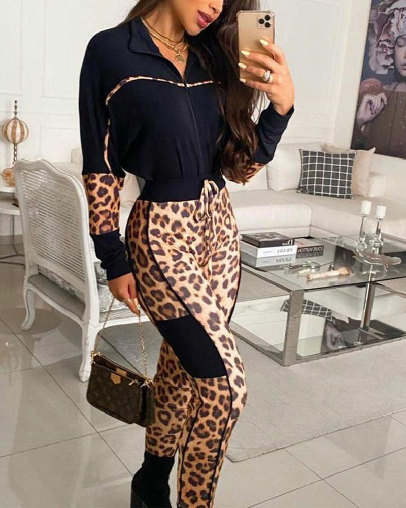 Style:Chic Type:Pants Sets Material:Polyester Neckline:Turn-down Collar Sleeve Style:Long Sleeve Length:Long Pattern Type:Leopard Decoration:Zipper,Drawstring Fit Type:Regular Occasion:Daily Package Include:1* Pants Set