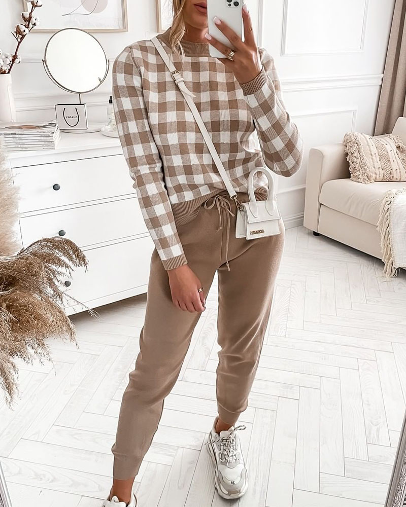 Style:Casual Type:Pants Sets Material:Rib-Knit Neckline:Round Neck Sleeve Style:Long Sleeve Length:Long Pattern Type:Plaid Decoration:Drawstring Fit Type:Regular Occasion:Daily Package Include:Pants Set